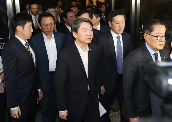 국민의당 안철수 전 대표와 박지원 원내대표가 박근혜 대통령 탄핵소추안이 가결된 9일 오후 국회 본회의장을 나서고 있다./연합뉴스