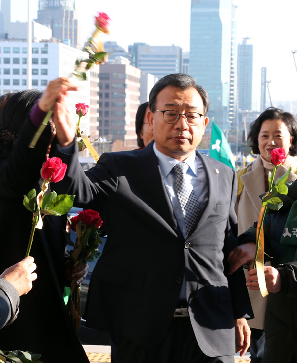 '탄핵찬성 꽃' 뿌리치는 이정현 대표