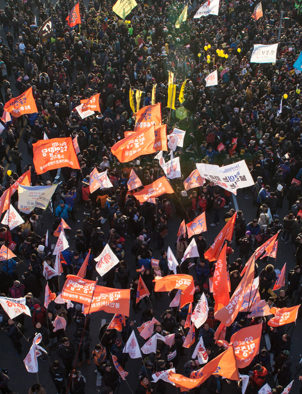 박근혜 대통령에 대한 탄핵소추안이 가결된 9일 오후 서울 영등포구 국회 모인 시민들이 환호하고 있다.