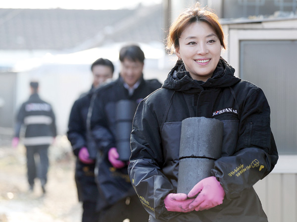 13일 오후 부천시 오정구 대장동의 한 마을에서 열린 ‘대한항공 노사 한마음 연탄나누기 행사’에서 대한항공 임직원들이 어려운 이웃에게 연탄을 전달하고 있다. /연합뉴스