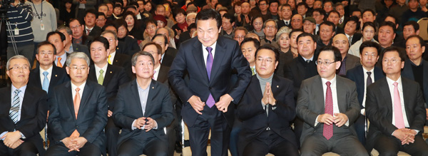 손학규 전 민주당 대표(가운데)가 13일 오후 서울 용산구 백범김구기념관에서 열린 ‘동아시아미래재단 창립 10주년 기념식’에 참석해 기조연설을 위해 단상으로 향하고 있다. 앞줄 왼쪽부터 더불어민주당 김종인 전 대표, 국민의당 김동철 비상대책위원장, 안철수 전 공동대표, 손 전 대표, 새누리당 정진석 전 원내대표, 주호영 의원, 국민의당 천정배 전 공동대표./연합뉴스