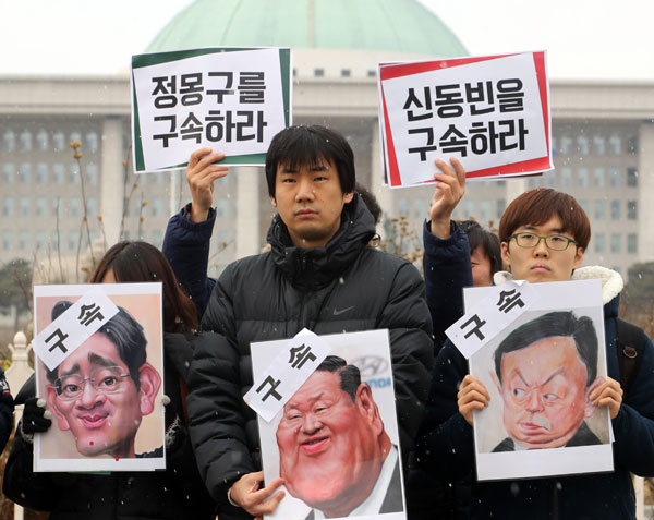 14일 서울 여의도 국회의사당 앞에서 박근혜 퇴진 비상국민행동 재벌구속특위 주최로 열린 재벌총수 끝장 청문회 촉구 기자회견에서 참석자들이 재벌 총수의 얼굴이 그려진 캐리커처를 들고 있다./연합뉴스
