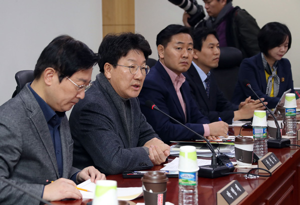 국회 소추위원단장인 권성동 법사위원장(왼쪽 두번째)이 18일 오후 국회 의원회관에서 열린 탄핵심판소추위원단·대리인단 첫 회의를 주재하고 있다. 왼쪽부터 더불어민주당 박범계, 새누리당 권성동, 국민의당 김관영, 국민의당 손금주, 정의당 이정미./연합뉴스