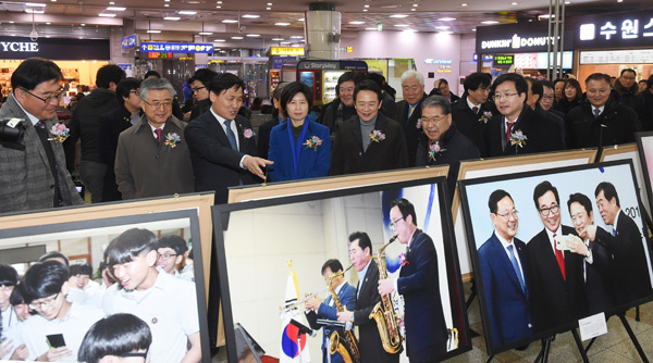 한국사진기자협회 경기지부 주최로 지난 16일 수원역 맞이방에서 열린 2016 경기지역 보도사진전에서 남경필 경기도지사, 이재정 경기도교육감, 염태영 수원시장, 심재인 경기신문 사장 등 참석 내빈들이 사진을 관람하고 있다.