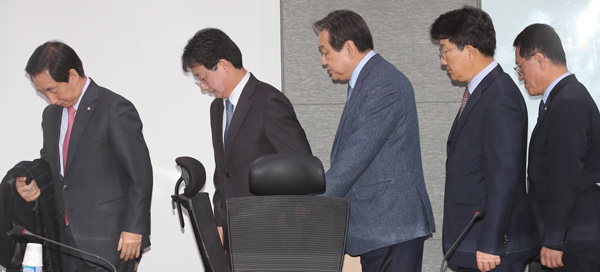 새누리당 김무성 전 대표와 유승민 의원이 21일 오전 서울 여의도 국회 의원회관에서 비주류의원들과 회동 후 열린 기자회견을 마친 뒤 회의실을 나서고 있다. 왼쪽부터 김성태, 유승민 의원, 김무성 전 대표, 권성동, 정운천 의원./연합뉴스