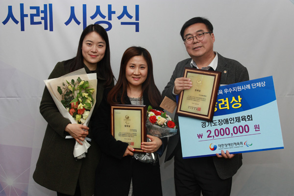 대한장애인체육회가 주관하는 2016 생활체육지원 (시도 단체상) 우수사례 장려상을 받은 경기도장애인체육회 김효수 부장(오른쪽부터)과 통합체육수업교실 장려상 을 받은 안산 대남초조달응, 이정은 교사가 기념촬영을 하고 있다./경기도장애인체육회 제공