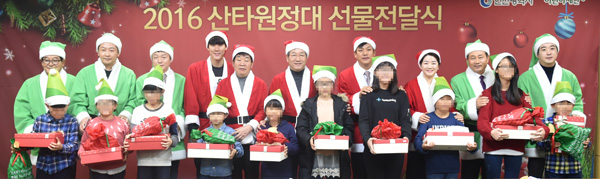 22일 오후 인천시청에서 열린 ‘2016 산타원정대 선물 전달식’에서 유정복 인천시장, 제갈원영 인천시의회 의장, 수영 선수 박태환 등 관계자들이 산타복장을 하고 어린이들과 함께 기념촬영을 하고 있다./인천시 제공