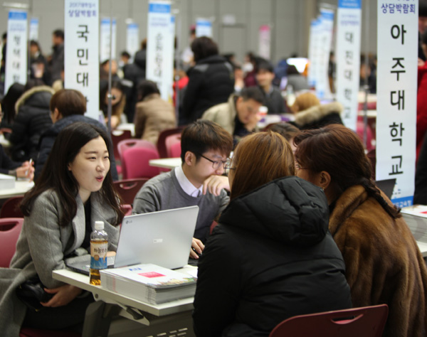 지난 23일 일산 킨텍스 제2전시관에서 열린 경기도교육청 주관 ‘2017 정시대입상담박람회’에서 학부모와 수험생이 전형 상담을 하고 있다. /연합뉴스