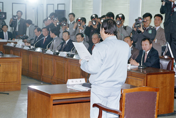 ‘최순실 게이트’의 장본인인 최순실 씨에 대한 ‘구치소 청문회’가 오는 26일 열린다. 구속 상태의 피의자를 상대로 구치소 현장에서 진행하는 청문회는 1997년 국회 한보특위 청문회 이후 19년 만이다. 사진은 당시 청문회에 참석한 정태수 회장이 증인선서하는 모습./연합뉴스