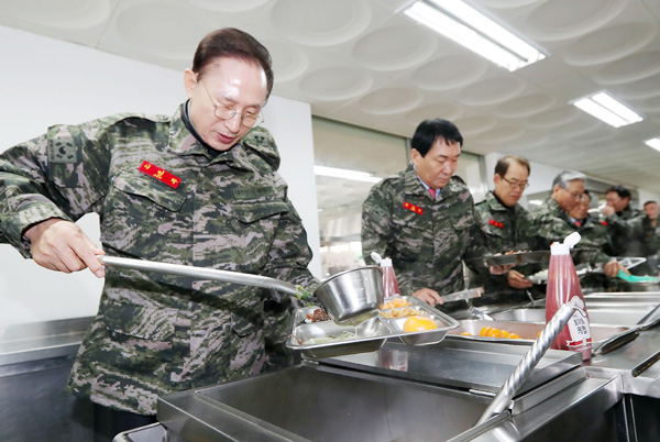 이명박 전 대통령이 28일 오전 인천시 강화군 해병대 2사단 5연대 52대대를 방문해 장병과 함께 식사하고자 국을 뜨고 있다. /연합뉴스