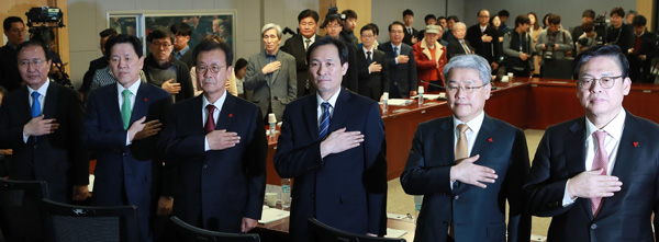 4일 오후 서울 여의도 국회 의원회관에서 열린 ‘선거제도개혁 그리고 개헌’ 토론회에 여야 각당 원내대표 등 지도부가 국기에 대한 경례를 하고 있다.새누리당 정우택 원내대표(오른쪽부터), 국민의당 김동철 비상대책위원장, 더불어민주당 우상호 원내대표, 원혜영 의원, 국민의당 주승용 원내대표, 정의당 노회찬 원내대표./연합뉴스
