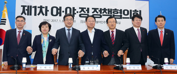 8일 오후 국회에서 열린 제1차 여ㆍ야ㆍ정 정책협의회에서 유일호 부총리 겸 기획재정부 장관과 여야 정책위의장들이 회의에 앞서 기념촬영을 하고 있다. 왼쪽부터 이준원 농식품부 차관, 국민의당 조배숙 정책위의장, 더불어민주당 윤호중 정책위의장, 유 부총리, 새누리당 이현재 정책위의장, 바른정당 이종구 정책위의장, 정은보 금융위 부위원장./연합뉴스
