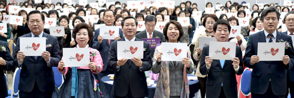 유정복 인천시장이 지난 6일 시청 대회의실에서 열린 ‘2017 인천여성 신년인사회’에서 주요 인사들과 함께 ‘우리는 인천’이라는 슬로건을 외치고 있다./인천시 제공