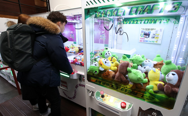 10일 서울 종로구의 한 인형 뽑기 방에서 한 시민이 인형 뽑기를 시도하고 있다. 전국 인형 뽑기방 수가 최근 2년 사이 24배 가량 증가하는 등 대표적인 ‘불황 업종’으로 꼽히는 인형 뽑기가 성행하고 있다./연합뉴스