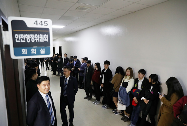 11일 오후 안전행정위원회가 열리는 서울 여의도 국회 회의장 앞에서 선거권 연령 인하를 요구하는 청소년들이 침묵 시위를 하고 있다.이들은 이날 정론관에서 기자회견을 통해 만18세 이상 청소년들에게 대통령, 국회의원, 기초단체장 선거권을, 그리고 만 16세 이상 청소년들에게 교육감 선거권을 허용할 것을 촉구했다./연합뉴스