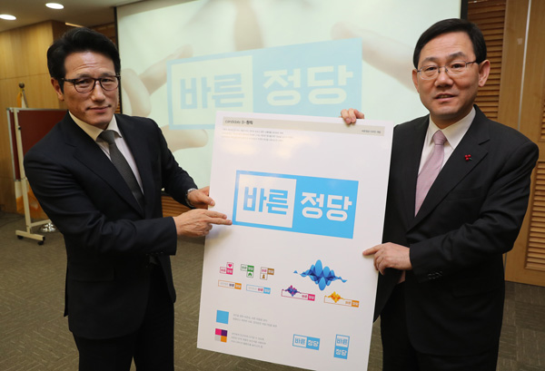 바른정당 정병국 창당준비위원장(왼쪽)과 주호영 원내대표가 15일 오후 국회의원회관에서 전체회의를 열고 ‘스카이블루’의 로고·당 색깔 등을 공개하고 있다.바른정당은 국민을 하늘로 생각하겠다는 각오를 담아 ‘스카이블루’색을 당 색깔로 정했다고 밝혔다./연합뉴스