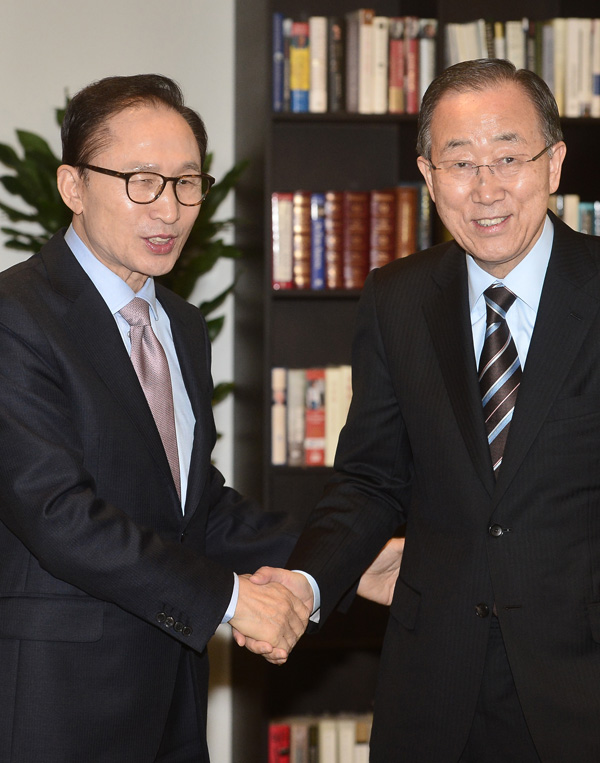 반기문 전 유엔 사무총장(오른쪽)이 19일 오후 서울 강남구 이명박 전 대통령 사무실을 방문, 이 전 대통령과 인사를 하고 있다./연합뉴스