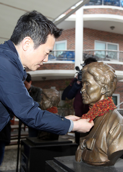 29일 오전 남경필 경기도지사가 광주 퇴촌면 나눔의 집을 방문해 나눔의 집 마당에 있는 위안부 소녀상과 나눔의 집에 계시다 먼저 돌아가신 할머니들을 추모하고 있다./경기도 제공