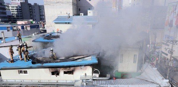 31일 오후 서울 남대문 시장 아동복 상가 화재 현장에 투입된 소방대원들이 진압작전을 벌이고 있다./연합뉴스