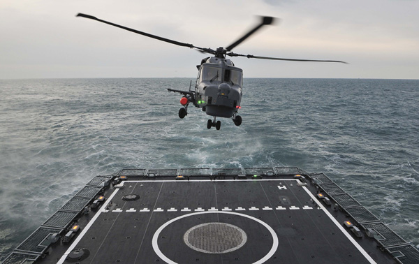 1일부로 작전 배치된 해군 해상작전헬기 AW-159가 광주함 헬기갑판에서 긴급출격을 하고 있다. /해군 제공