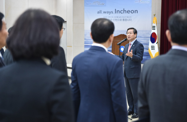 유정복 인천시장이 1일 시청 대회의실에서 민선6기 후반기를 맞아 300만 도시에 걸맞은 인천주권시대로 도약하기 위한 조직 개편을 실시하고 이에 따른 대규모 승진인사를 단행하며 임용장을 수여 후 인사말을 하고 있다. /인천시 제공