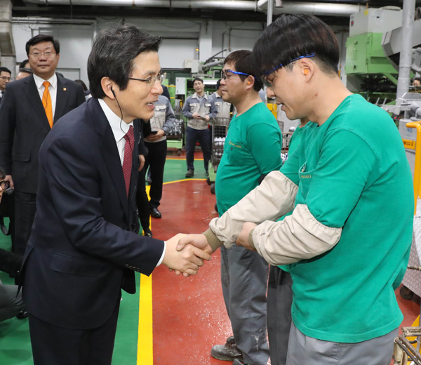 황교안 대통령 권한대행 국무총리가 2일 안산시 반월공단 스마트공장인 동양피스톤을 방문, 직원들을 격려하고 있다. /연합뉴스