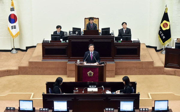 유정복 인천시장이 7일 인천광역시의회 본회의장에서 열린 ‘제239회 임시회 1차 본회의’에서 2017년도 시정운영 방안을 보고하고 있다. /인천시 제공
