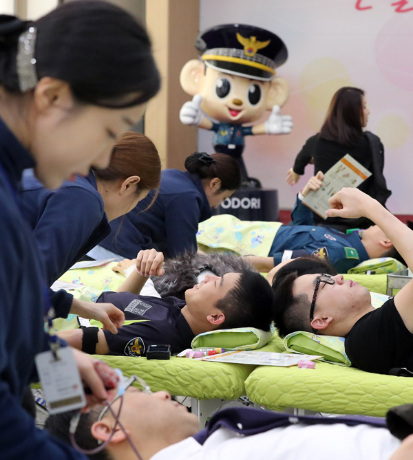 8일 서울시 서대문구 미근동 경찰청에서 열린 ‘겨울철 혈액 난 해소를 위한 사랑의 헌혈 봉사’에서 경찰관 및 전의경 대원들이 헌혈을 하고 있다. /연합뉴스