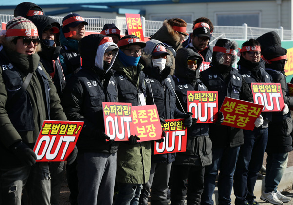 항만 예인선 연합노동조합 조합원들이 9일 오전 인천시 연수구 한국가스공사 인천기지본부 앞에서 인천·평택 액화천연가스(LNG)기지 예인선 입찰 계약 중단을 촉구하는 집회를 하고 있다. /연합뉴스