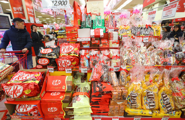 초콜릿·사탕 수입액이 6년 연속 최고치를 경신했다고 관세청이 발표한 9일 오후 서울시 중구 롯데마트 서울역점에서 밸런타인데이를 맞아 다양한 수입 초콜릿이 판매되고 있다./연합뉴스