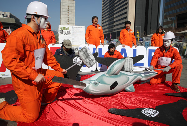 환경운동연합 바다위원회와 환경보건시민센터 회원들이 14일 오후 서울 종로구 광화문 광장에서 전시용 돌고래를 수입한 울산남구청과 이를 허가한 환경부, 해양수산부를 규탄하는 기자회견을 하던 중 퍼포먼스를 하고 있다./연합뉴스
