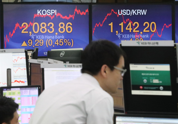 코스피가 15일 미국 증시 호조와 기관 매수세에 힘입어 하루 만에 반등해 2,080선을 회복했다. 이날 코스피는 전날보다 9.29p(0.45%) 오른 2,083.86에 거래를 마쳤고 원달러 환율은 4.8원 오른 1,142.2원에 장을 마감했다. 15일 오후 서울 중구 을지로 KEB하나은행 본점 딜링룸에서 딜러들이 업무를 보고 있다.