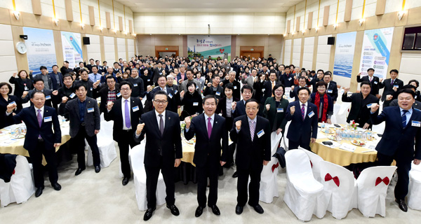 유정복 인천시장이 지난 17일 연수구청에서 열린 ‘소통·공감·혁신 시민행복더하기 대화’에서 이재호 연수구청장 및 구민들과 ‘우리는 인천’을 외치고 있다. /인천시 제공