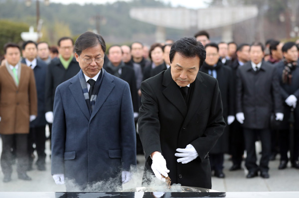 국민의당 대선후보인 손학규 전 국민주권개혁회의 의장(오른쪽)과 천정배 전 대표가 20일 오전 광주 북구 운정동 국립5·18민주묘지를 주승용 원내대표 등 지도부와 합동 참배하며 분향하고 있다. /연합뉴스