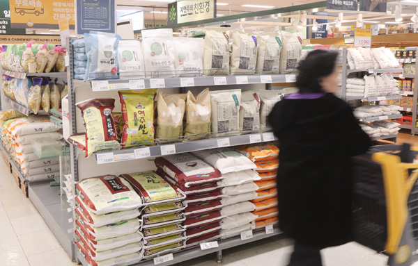 30여 년간 한 해도 거르지 않고 하락세 보여온 1인당 연간 쌀 소비량이 올해는 60㎏ 이하로 떨어질 것이라는 전망이 발표된 27일 오후 서울의 한 대형마트에서 시민들이 쌀 판매대 앞을 지나고 있다. /연합뉴스