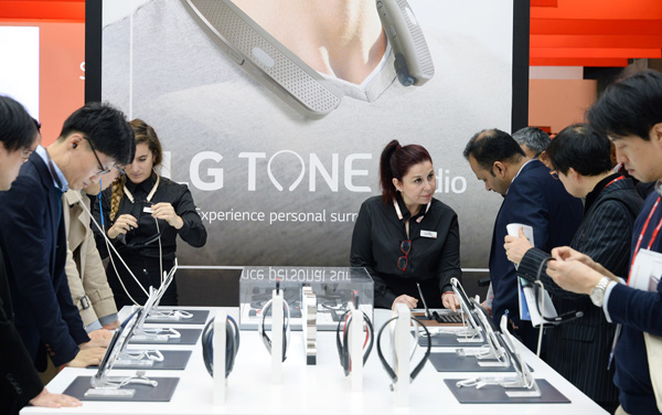 28일 스페인 바르셀로나 피라 그란비아에서 열리고 있는 ‘모바일 월드 콩그레스(MWC) 2017’에서 LG전자 부스를 찾은 관람객들이 제품들을 살펴보고 있다. /연합뉴스