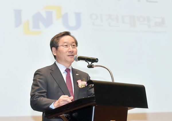 유정복 인천시장이 2일 인천대학교 송도캠퍼스에서 열린 ‘인천대학교 2017학년도 입학식’에서 축사를 하고 있다. /인천시 제공