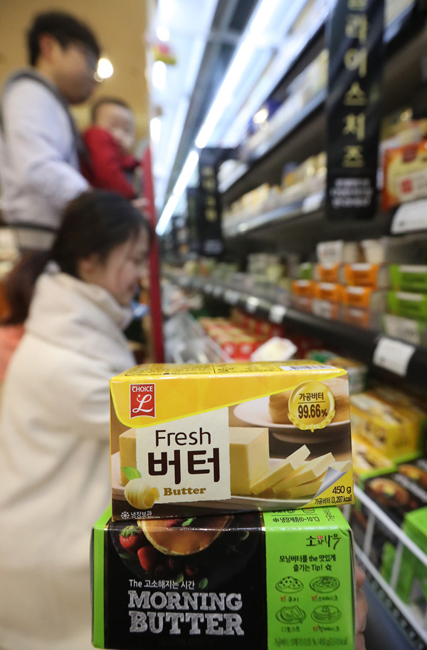 버터 등 국제 유제품 가격 지수가 2년 6개월 만에 최고 수준을 나타냈다. 5일 서울시내 한 대형마트에서 시민들이 버터 등을 고르고 있다./연합뉴스