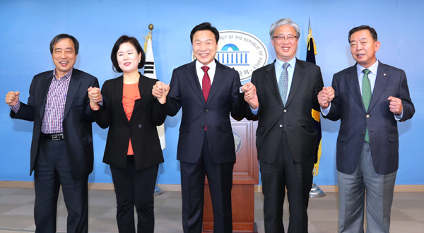 국민의당 대선주자인 손학규 전 대표가 5일 오후 국회 정론관에서 기자회견을 열고 유성엽 국회 교문위원장의 경선대책본부장 영입과 김유정 대변인 영입을 소개한 뒤 손을 잡고 인사하고 있다. 왼쪽부터 박우섭 최고위원, 김유정, 손학규, 유성엽, 이찬열 최고위원. /연합뉴스
