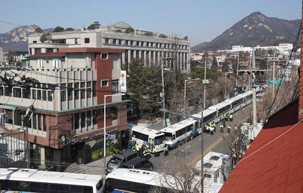박근혜 대통령 탄핵 선고일인 10일 오전 서울 종로구 헌법재판소 주위로 경찰차벽이 에워싸고 있다