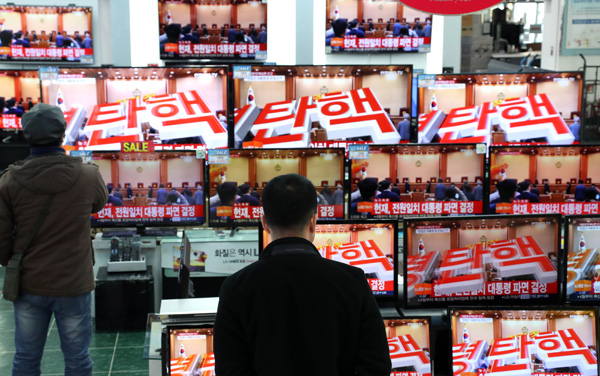 10일 오전 서울 용산구 전자랜드에서 시민들이 TV로 헌법재판소의 박근혜 대통령 파면 선고를 보고 있다.