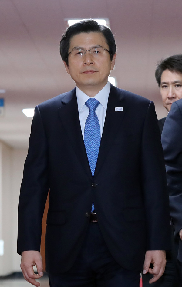 황교안 대통령 권한대행 국무총리가 10일 오후 서울 세종로 정부서울청사에서 박근혜 전 대통령 탄핵에 따른 국무회의를 주재하기 위해 회의장으로 들어서고 있다. 헌법재판소는 이날 오전 11시 대심판정에서 열린 박 전 대통령 탄핵심판 사건의 선고 재판에서 재판관 8명 전원의 일치된 의견으로 파면을 결정했다.