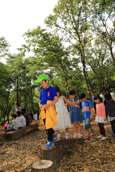 어린이들이 과천 문원유아숲체험원에서 체험활동을 통해 숲과 친해지는 방법을 배우고 있다. /과천시 제공