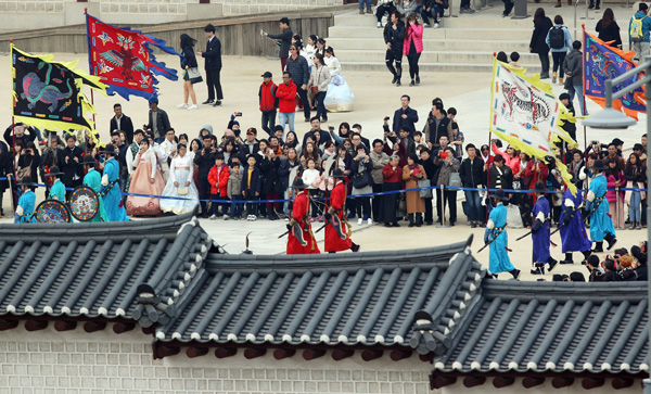 포근한 초봄 날씨를 보인 12일 오후 서울 종로구 경복궁에서 관광객들이 수문장 교대식을 관람하고 있다. /연합뉴스