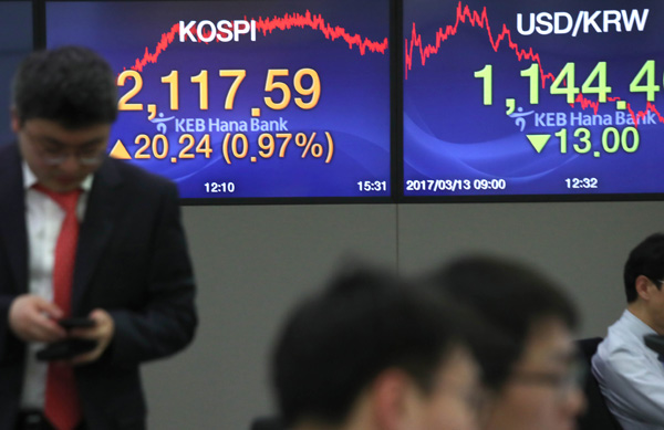 코스피가 20.24포인트 올라 2,117.59로 연중최고치를 기록한 13일 오후 서울 중구 을지로 KEB하나은행 본점 딜링룸에서 딜러들이 업무를 보고 있다./연합뉴스