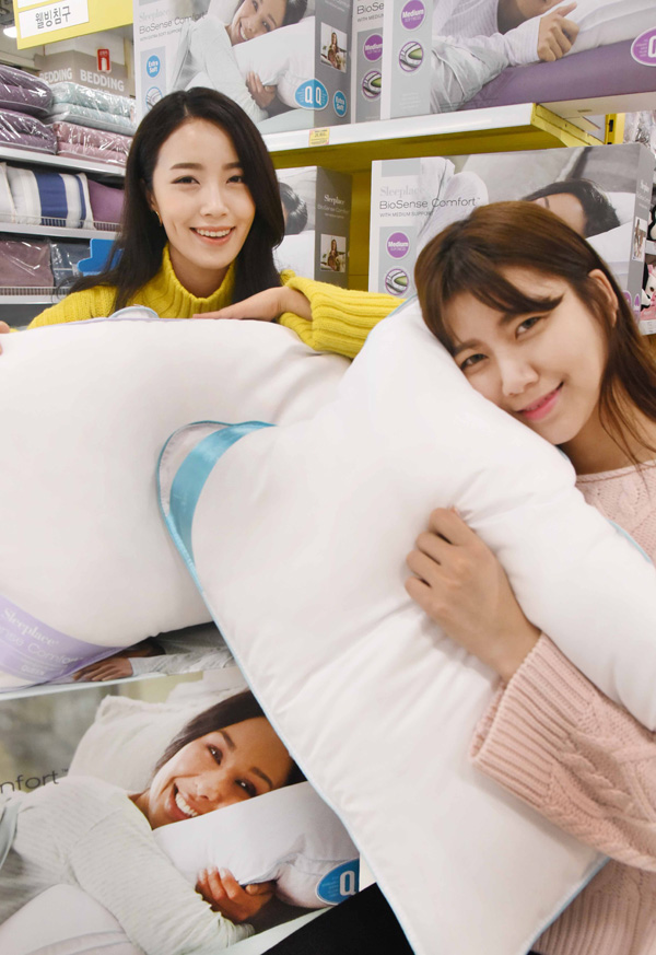 14일 홈플러스 강서점에서 모델들이 다운필 베개를 선보이고 있다. 홈플러스는 창립 20주년을 맞아 오는 29일까지 전국 108개 점포에서 다운필 베개를 2만9천900원에 판매한다./홈플러스 제공