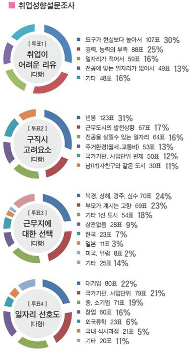 다항선택으로 된 직장선호도를 살펴본 결과 대기업이 1표의 근소한 차이로 1위를 차지했고 국가기관, 사업단위가 2위를 차지했다. 창업에 대한 선호도가 60표로 나타나 눈여겨볼만하다.<투표4>