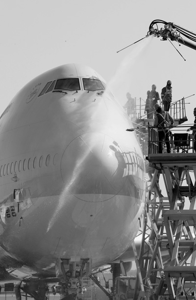 대한항공 직원들이 22일 오전 인천시 중구 인천공항 대한항공 정비 격납고에서 봄을 맞아 보잉 747-8i 차세대 항공기의 동체 세척작업을 하고 있다. /연합뉴스