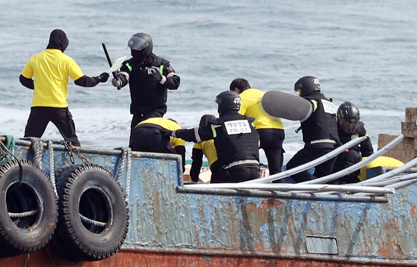 23일 오후 인천시 중구 인천해양경비안전서 전용부두 인근 해상에서 열린 ‘서해5도 특별경비단 불법 외국어선 단속 시범훈련’에서 대원들이 불법조업에 나선 중국선원들을 체포하는 훈련을 하고 있다. /연합뉴스