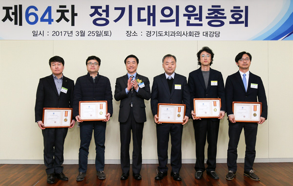 25일 오후 경기도 치과의사회관 대강당에서 열린 ‘경기도 치과의사회 대의원 총회’에서 이재율 경기도 행정1부지사가 유공자에 대한 시상을 하고 기념촬영을 하고 있다. /경기도 제공